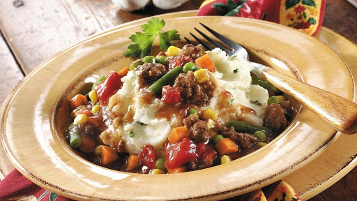 Ground Beef Stew over Cheesy Mashed Potatoes
