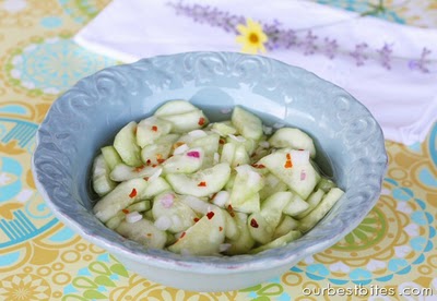 Place cucumber slices in a colander sitting over a bowl, sprinkle with salt and toss well. Let sit for 1 hour refrigerated. Toss the cukes a few times while they drain as well. While cucumber slices are draining, prepare marinade below.