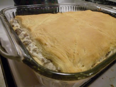 Roll the remaining pkg of crescent rolls lightly over the top of the sausage mixture. Pinch the edges and also the sides so no mixture seeps through. {Easier said than done. I ended up having some come through one side but it wasn't a big deal.}