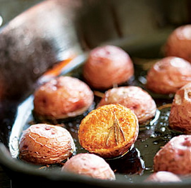 The best kind of pan for roasting these potatoes is an old-fashioned cast-iron skillet. I use a 10-inch skillet for about 8 potatoes (16 halves), but if your skillet is 12 inches, you can fit 10 potatoes (20 halves). I prefer smallish potatoes—2 or 3 inches in diameter—cut just in half, which keeps the interiors moist and creamy. I like to use coarse sea salt, as the large crystals give a nice crunch without oversalting the potatoes, but kosher salt works nicely, too.