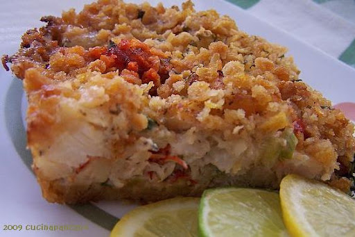 Melt butter and pour over crumbs into a bowl. Reserve the other half. In a separate bowl mix together all the ingredients and seasonings.. adding seafood lastly, mixing in well. Make a layer of blended crumbs in the bottom of a greased baking pan or brownie pan. Spread mixed batter next layer. Sprinkle remaining buttered crumb mixture on top. Drizzle with a bit of olive oil and a few shakes of paprika. Bake uncovered 20-25 minutes or until there are no liquids remaining. Allow to set before serving. Enjoy!