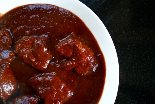 Remove pork from smoker and cut into cubes ½” to 1" square and put into baking pan/dish about 3"-4" deep. Pour chili colorado over pork cubes (the pork should be “swimming in it”) and put baking pan/dish into smoker – crank up the temp to around 325 (you can do this part in the oven inside if you want) and let it simmer (for best results, seal tightly with foil so the sauce doesn’t boil off and get too thick) for at least an hour – 2 or even 3 hours would be even better (if you simmer longer than an hour you must seal with foil or the sauce will boil off).