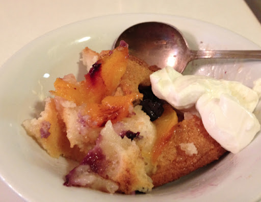 I used fresh peaches, and only about a third, maybe half, of the syrup. I also tossed about 2 dozen fresh blueberries on the top just as it went into the oven. Next time I'll add some chopped pecans. I had to let it bake for about 50 minutes so that it wasn't too syrupy when it came out of the oven. Once it cooled a bit, the crust absorbed the remaining liquid. Serve with a dollop of Cheesecakey Whipped Cream (see recipe in my Desserts cookbook).