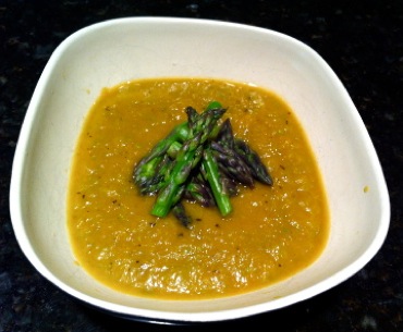Heat bacon fat in your cast iron skillet over high heat. When it is nice and hot, carefully add the butternut squash (I have some nice grease-burns on my forearm for skipping the careful part). Add a good amount of salt (2 Tbsp). The salt will bring all the natural sugars out in the butternut squash. Continue to cook over high heat for 10 minutes, stirring almost constantly ever-so-gently. You want the chunks to brown up on all sides. Reduce the heat and cook 15 more minutes, stirring gently a couple more times. Remove the squash to a large bowl. Meanwhile, divide the asparagus. You need about 3/4 of it for the soup and 1/4 for garnish. Chop 3/4 of the asaparagus. Add the chopped asparagus and onion to the skillet. Cook over medium-high for 10 minutes, stirring often, until soft. Add the chicken broth and bring to a boil. Add the rest of the asparagus spears and blanch in the broth for 1 minute. Remove the spears. Set aside. Pour the remaining mixture into the bowl with the butternut squash. Using your immersion blender, food processor or blender, puree it up! Chop up the reserved asparagus to serve on top of the soup.