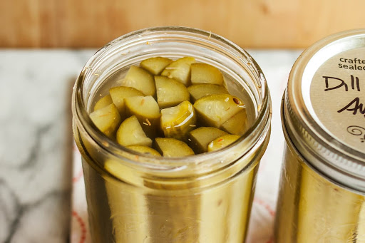 1. Prepare the jars: If you are planning to can your pickles for long-term storage, bring a large pot of water to a boil and sterilize the jars and their lids. If you are planning to make refrigerator pickles, simply washing the jars and lids is fine.