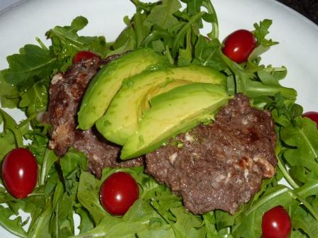 Mix all ingredients except avocado together. Form into burger patties. Grill to desired level of doneness. I served mine on a bed of arugula and tomatoes and topped it with avocado.