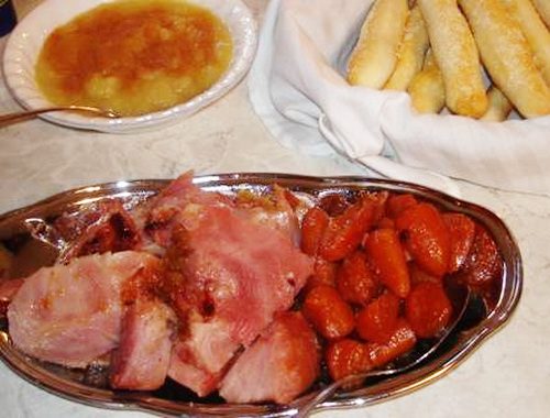 Rub fat side of ham with brown sugar. Peel sweet potatoes and arrange around ham (or dump in a can or two of canned ones, they didn’t get too mushy). Pour crushed pineapple over ham.