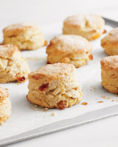 These scones are crisp and golden with a light, flaky interior. The fruit offers a slightly chewy contrast. Orange zest and Grand Marnier flavor the scones. Serve them with butter and tea.