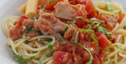 2. Meanwhile, heat oil in a large nonstick skillet over medium-high heat. Add garlic and cook, stirring, until fragrant, about 1 minute. Add anchovies (if using) and crushed red pepper and cook for 30 seconds more. Add tomatoes, reduce heat to medium and cook, stirring occasionally, for 8 minutes. Stir in tuna and cook until it is incorporated into the sauce and heated through, 2 minutes more. Divide the spaghetti evenly among 4 plates, top with sauce and garnish with basil. Serve hot.