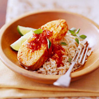 4. Season fish to taste with salt and ground black pepper. If desired, garnish with lime slices and oregano sprigs and serve with rice. Pass remaining sauce. Makes 4 servings.