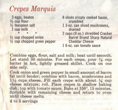 Cook onion and green pepper in small amount of bacon fat until tender; combine with bacon, mushrooms and 1 1/2 cups cheese. Fill each crepe with about 1/4 cup cheese mixture; roll.
