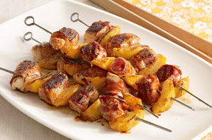 RESERVE 2 Tbsp. barbecue sauce. Stack 1 each chicken and peach piece; wrap with 1 bacon piece. Repeat with remaining chicken, peaches and bacon. Thread onto 4 skewers. Brush with remaining barbecue sauce.