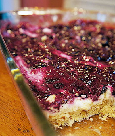 3. Beat cream cheese and powdered sugar. Add whipped topping and spread over the cooled crust. Top it off with the blueberry mixture and refrigerate.