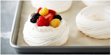 For assembly, whip the cream to soft peaks and stir in the sugar and vanilla. Place a birds’ nest onto each plate, dollop the cream into the centre of the nest and top with berries. Serve immediately.