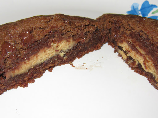 Chocolate cookie with chocolate chips, stuffed with a fun size peanut butter cup~