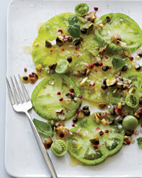 - 4 Green Zebra or other ripe green heirloom tomatoes, very thinly sliced
