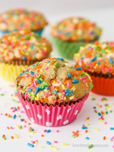 Combine wet and dry ingredients, stirring until just mixed, do not over stir. Scoop into muffin pans with liners, filling about 2/3 of the way full. Once all cups are full, top with a sprinkle of sprinkles.