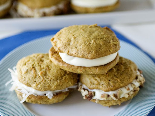 To assemble the whoopie pies, put the filling into a resealable bag and snip the corner to make a 1/2-inch opening. Put the chopped walnuts into a shallow dish or pie plate. Flip over 1 carrot cake cookie and pipe a dollop of frosting into the center. Top with another cookie and press gently to spread the frosting to the edges. Roll the edges of the whoopie