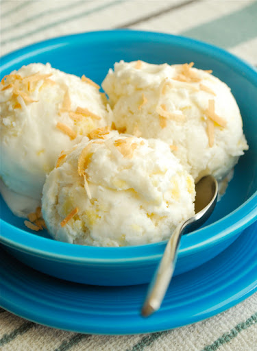 Combine cream of coconut, coconut milk, whole milk and pineapple juice in a large mixing bowl. Add coconut flakes and stir to combine. Pour into ice cream maker (I use this one) and freeze according to the manufacturer’s instructions.