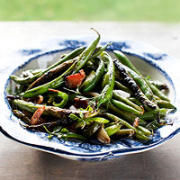 2. In a very large skillet, cook bacon over medium heat for 6 to 8 minutes, until browned and crisp. Transfer to paper towels to drain, leaving fat in skillet. Add oil to fat in skillet and increase heat to high. Add beans, the remaining 1/2 teaspoon salt, and the pepper. Cook for 8 to 10 minutes, stirring occasionally, until beans are blistered and crisp tender. Stir in garlic and cook 1 to 2 minutes, stirring until garlic is browned. Season with salt and pepper to taste. Transfer beans to a serving platter, then top with cilantro, jalapeno, bacon, and drained pickled shallots.