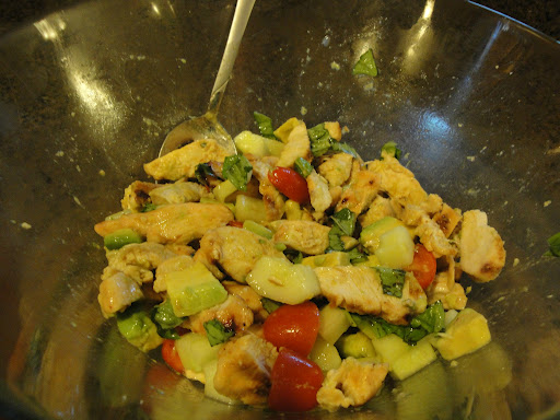 5. Add avocado, tomatoes, cucumber, basil and the reserved marinade.