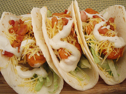 Once fully cooked, toss the chicken strips in the buffalo sauce. Warm the tortillas for 15 seconds in the microwave. Place a single chicken strip in the center of each tortilla. Top each taco with even portions of cheese, lettuce and bacon. Lightly drizzle the top with ranch dressing. Makes 6 tacos.