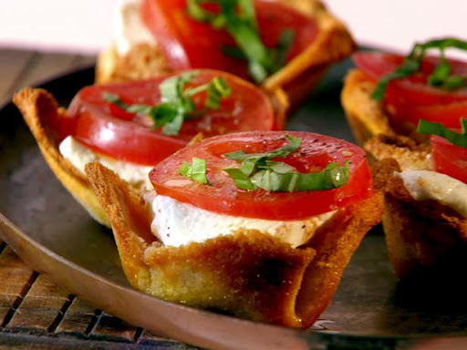 In a small bowl, using a fork to combine, mix together the cream cheese, garlic powder, dried basil, salt, and pepper until smooth and creamy. Drop about a teaspoon of the cream cheese into the bottom of each muffin tin. Bake the tartlets until golden and crusty, 12 to 13 minutes.