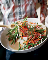 In a large pot of boiling salted water, cook the beans until crisp-tender, about 2 minutes. Drain, rinse and pat dry.