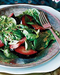 In a large bowl, toss the spinach, basil and plums. Add the dressing and toss well. Sprinkle with sea salt and black pepper (so there are flakes clinging to the leaves) and serve right away.