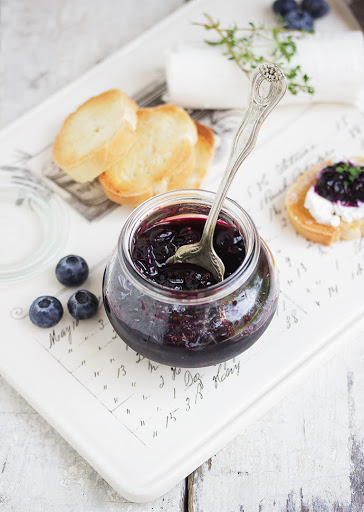 Wash and pick over blueberries. Remove whole spices from the vinegar and discard. Stir blueberries and the white and brown sugars in to the vinegar. Return pot to stove and bring to a boil over medium-high heat. Avoid stirring to aggressively to avoid crushing the blueberries. Once it comes to a boil, allow to boil undisturbed for about 5 minutes until thickened (you can swirl the pan a bit if you like to mix, but avoid stirring). Remove from the heat and let cool slightly.