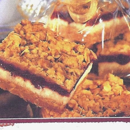 With mixer beat flour, oats, 3/4 cup sugar and butter until crumbly. Set asside 1-1/2 cups mixture. press remaining mixture on bottom of greased 13x9 in baking pan Bake 15 min or until lightly browned