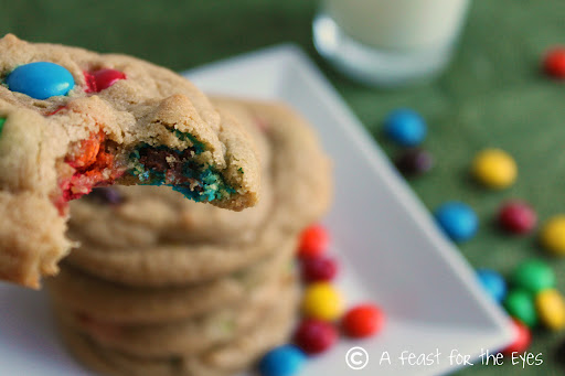 This recipes is adapted by the food blog, "How Sweet It Is", who adapted it from the Cook's Illustrated recipe for "Perfect Chocolate Chip Cookies". This version is easier, because you don't brown the butter (not that it's a bad thing). The beauty of this cookie recipe is that you melt the butter in the microwave (or stovetop if you wish) and the whole batter comes together so easily, with a whisk. Does it get any easier than that? The technique is different, in that you roll the dough into a ball, pull it in half and then stack the two "ends" on top of one another. The end result? A chewy cookie on the inside, with crispy edges. It's a versatile cookie, so add chips or (in this case) M&Ms. Nuts are optional. Too see how I made this, jump to my food blog for step-by-step photos.