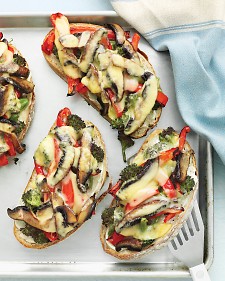 Your broiler does the work for these open-face sandwiches, first roasting the broccoli, mushrooms, and peppers, then melting the Gouda cheese over the tops. Spread with bread with garlic mayonnaise before piling on the vegetables.
