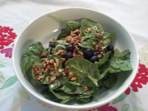 spinach, blueberries and roasted pecans, dressing is sweet with blue cheese