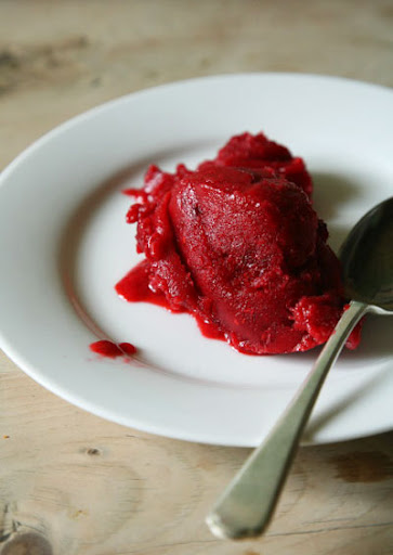3. Purée 1 lb. of the raspberries (about 4 cups) with the syrup in a blender or food processor until smooth. Scrape the purée through a fine sieve into a bowl; discard the seeds. Stir lemon juice into the raspberry purée and pour it into a 2-quart ice cream maker. Put in Ziploc bag and freeze for 2-3 hours.