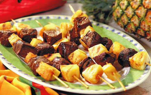 Drain the beef and pineapple, reserving marinade. Thread the beef and pineapple alternately onto wooden skewers.