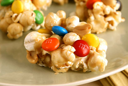 3. Immediately pour caramel mixture evenly over popped corn and candy until coated. Do not stir. Let stand 30 minutes or until caramel has cooled and hardened.