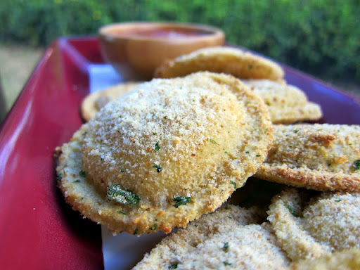 Whisk together egg and milk in shallow bowl. In another bowl or pie plate, combine bread crumbs and parmesan cheese. Dip ravioli in egg and then in bread crumbs. Place on baking sheet. Repeat until all ravioli are coated. Spray ravioli with cooking spray.