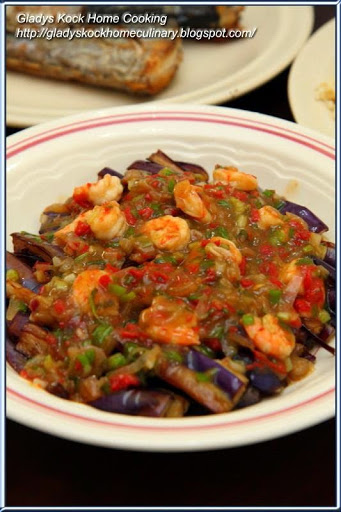 An easy to prepare delectable spicy eggplant recipe (aka brinjal, or aubergine), by deep-frying the eggplant, and then topped with mixture of stir-fry prawn and chilli sauce in one plate, to satisfy spicy food craving!