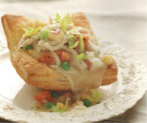 These pretty petite pot pies are served in individual puff pastry cups that have been baked in a muffin tin. The result is an open faced pot pie rich with vegetables lemon-pepper chicken and a homemade Parmesan cream sauce. Hearty and satisfying these little pies are sure to warm up your guests on a crisp fall evening.