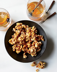 until a light amber caramel forms, about 10 minutes. Immediately pour the caramel over the popcorn and toss quickly with spoons to evenly coat the popcorn and peanuts. Spread the popcorn mixture on the baking sheet in an even layer and let cool completely. Break into bite-size pieces.