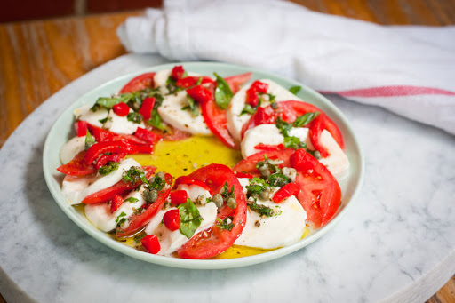 On serving platter, arrange mozzarella cheese slices and tomato slices in alternating layers. Add a basil leaf between each later. Top with roasted red peppers. Drizzle with the herb and olive oil mixture.