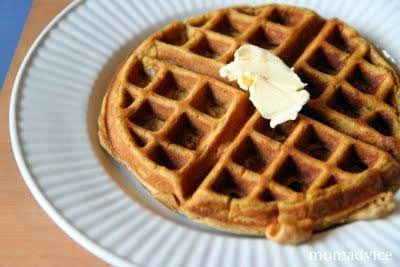 Mix together flour, baking powder, baking soda, cinnamon, nutmeg, ginger, and salt in large bowl. In a second bowl, add eggs, sugar, pumpkin, milk, and butter; beat well. Gently fold in the flour mixture. Spoon in about 3/4 cup of batter into the waffle iron. Cook each waffle for 4-5 minutes. This recipe makes approximately 5 waffles on my waffle iron.