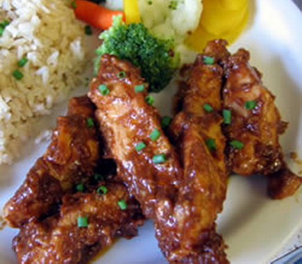 "This Thai-inspired dish can be made in less than 15 minutes. Strips of skinless chicken breast are cooked in sesame oil, and then coated with a sweet and spicy peanut sauce. Garnish with scallions, and serve with rice or noodles." — Suray Culinary Specialties