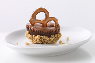 SPOON into resealable plastic bag; cut small corner from bottom of bag. Pipe about 1 Tbsp. pudding mixture into each of 24 paper-lined mini muffin cups; stand pretzel in each cup. Freeze 2 hours or until firm.