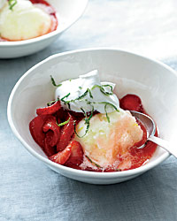 "Every house has an herb garden," says Daniel Humm of Ticino, the southern region of Switzerland. Accordingly, he infuses roasted peaches with honey-rosemary syrup. The mascarpone in the ice cream reveals the strong Italian influence on Ticino's cuisine.