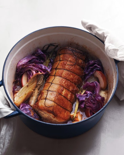 Add pork, nestling it into vegetables. Transfer to oven and cook, uncovered, 15 minutes. Remove pork and add remaining 2 apples, turning vegetables and pushing apples down into liquid. Return pork to pot and continue cooking until a thermometer inserted in thickest part of pork registers 138 degrees, 20 to 25 minutes more. Remove pork and let rest at least 10 minutes before slicing. If necessary, return vegetables and apples to oven and cook, covered, until fork-tender, 10 to 20 minutes more.
