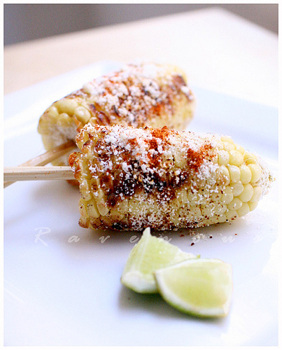 There are many methods of grilling corn and you may already have favorite technique. I like to peel of the entire husk and place it on the grill. By keeping the husks on, you’re essentially steaming them. However, if I’m strapped for time, I wrap each corn in saran wrap and microwave about 2-3 minutes then place it on the grill. I like to skewer my corns with chopsticks :)