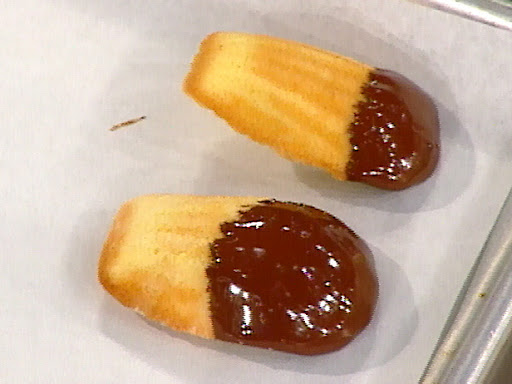 Preheat the oven to 350 degrees F. Grease and flour 24 madeline molds using the teaspoon of the butter and the 2 teaspoons of the flour. In a large mixing bowl, combine the eggs, sugar and vanilla. With an electric mixer set on high speed, cream the mixture until pale and fluffy, about 10 minutes. In a small mixing bowl, combine the flour and baking powder. Add the zest and half of the flour mixture and beat on medium speed until incorporated. Add the remaining flour mixture and beat again until incorporated. Add the butter in a steady stream and continue beating until well blended. Let stand for 10 minutes. Spoon the batter into the molds so that they are two thirds full. Bake until lightly golden, 18 to 20 minutes. Remove from the oven and using a thin knife, pop them out of the pans onto a wire rack. The cookies can be served either warm or cooled and dipped in the chocolate. To dip in the chocolate, dip half of each cookie in the chocolate, letting the excess drip and place on parchment lined baking sheet. Allow the cookies sit until the chocolate sets. Serve on a serving platter.