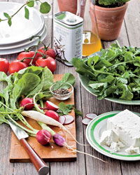 In a bowl, toss the tomatoes with the mint, radishes and olive oil and season with salt and pepper. Add the arugula and half of the feta and toss gently. Transfer the salad to a platter and sprinkle the remaining feta on top. Serve right away.